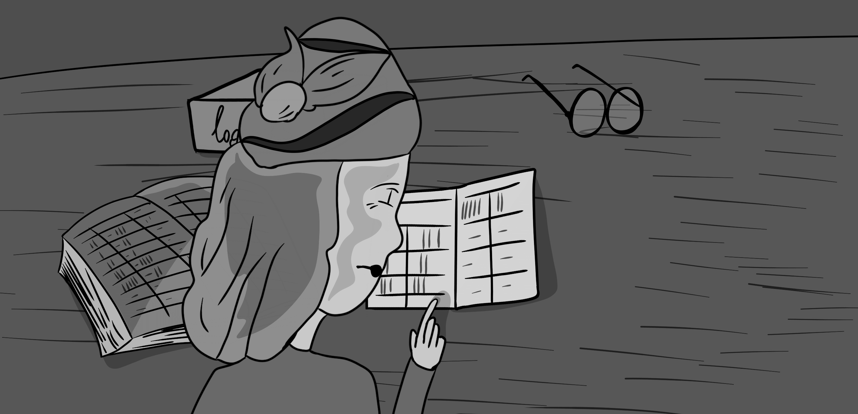 Bonny Brain studiert alte Logbücher, in denen die Stärke ihrer Mannschaft und die der gekaperten Schiffe steht: