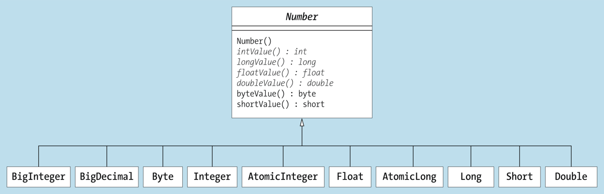Alle numerischen Wrapper-Klassen können den gespeicherten Wert in einem beliebigen anderen numerischen Typ liefern. Die Methodennamen setzen sich – wie zum Beispiel doubleValue() und intValue() – aus dem Namen des gewünschten Typs sowie Value zusammen. Technisch gesehen überschreiben die Wrapper-Klassen Byte, Short, Integer, Long, Float und Double aus einer Klasse Number[ 203 ](Zusätzlich erweitern BigDecimal und BigInteger die Klasse Number und haben damit ebenfalls die *Value()-Methoden. AtomicInteger und AtomicLong erweitern ebenfalls Number, sind aber nicht immutable wie die restlichen Klassen. ) die *Value()-Methoden[ 204 ](Nur die Methoden byteValue() und shortValue() sind nicht abstrakt und müssen nicht überschrieben werden. Diese Methoden rufen intValue() auf und konvertieren den Wert über eine Typumwandlung in byte und short. ).
